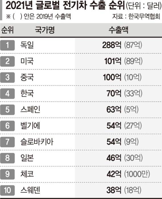 작년 한국의 전기차 수출액은 70억달러로 독일(288억달러), 미국(101억달러), 중국(100억달러)에 이어 세계 4위 규모였다.