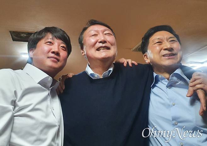 | ▲ 지난 2021년 12월 3일 울산광역시 울주군의 한 식당에서 만찬 회동(소위 울산회동)을 한 국민의힘 이준석 대표, 윤석열 대선후보, 김기현 원내대표(사진 왼쪽부터)가 서로 어깨동무를 하고 포즈를 취하고 있다. |