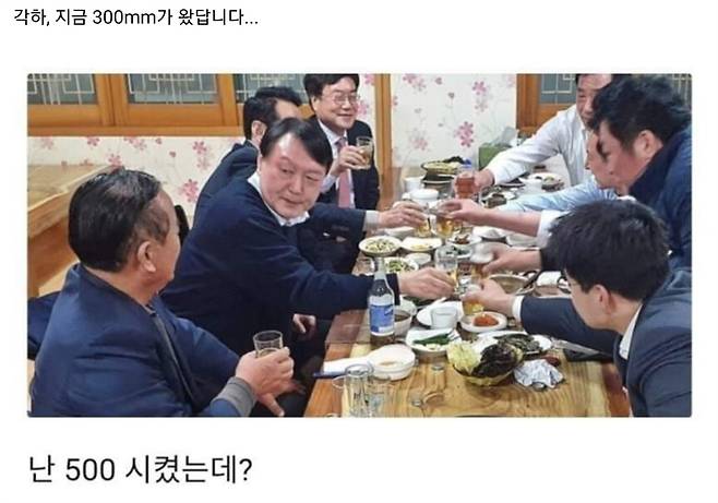 대표적으로 지난 8월 신림동 세 모녀가 참변을 당할 만큼 기록적 폭우가 내렸던 때 윤 대통령의 '귀가 대응'으로 논란이 폭발했습니다. 이때 "각하, 지금 300mm가 왔답니다"라는 말에, 윤 대통령께서 "난 500 시켰는데?"라고 엉뚱한 답을 하는 것 같은 밈이 만들어졌죠. 여기서 500은 맥주 500cc를 뜻하는 겁니다.