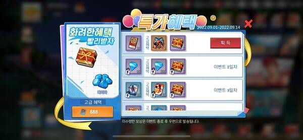 우선 게임에 접속만 해도 '3성 빛과 어둠의 선택권' 등 아이템이 지급되는 접속 이벤트가 이목을 끈다. 3성 빛과 어둠의 선택권은 여러 3성 빛-어둠 속성 소환수 중 원하는 소환수 1종을 선택해 획득할 수 있는 소환권으로 9월 29일까지 게임에 접속해 받을 수 있다. 6일과 9일, 10일에 접속하면 각 100만 개씩 총 300만 골드가 제공되고 6일부터 12일까지 특정 시각에 매일 접속하면 최대 23만 골드를 획득할 수 있는 이벤트를 즐길 수 있다.
