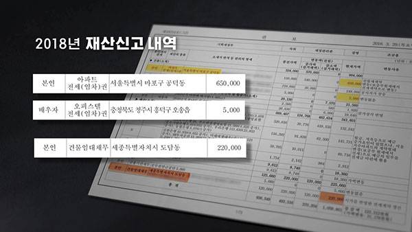 2018년 조 후보자의 재산공개 내역을 보면 서울 마포구 공덕동의 아파트와 충북 청주시 오피스텔을 본인 명의로 각각 6억 5천만 원과 5백 만원에 임차한 것을 확인할 수 있습니다. 실거주하라고 특공받은 아파트는 2억 2천만 원에 전세를 내줬습니다.