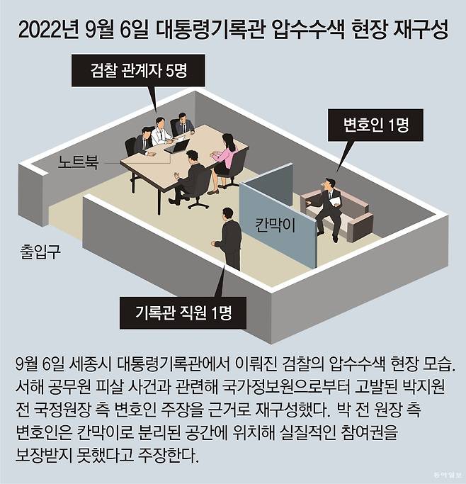 9일 동아일보 취재를 종합하면 검찰은 6일 대통령지정기록물 압수수색 과정에서 박 전 원장 변호인으로부터 항의를 받았다. 박 전 원장은 서해 공무원 피살 사건과 관련해 첩보 보고서를 삭제한 혐의 등으로 7월 6일 국정원으로부터 고발당했는데, 이 날은 이 사건을 수사 중인 검찰이 대통령기록관을 두 번째로 압수수색하던 날이었다.