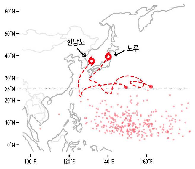 지도를 보면 알겠지만 필리핀 동쪽 해안에 점들이 몰려있는 걸 확인할 수 있습니다. 일종의 태풍의 요람인 셈이죠. 집중해서 봐야 하는 건 점선으로 표시된 북위 25도선(25°N) 위에 위치한 점입니다. 25°N 위에서 발생한 슈퍼태풍은 역대 2개뿐. 이번에 온 힌남노와 2017년 일본에 피해를 준 태풍 노루가 바로 그 녀석들이죠. 보통 태풍은 따뜻한 필리핀 동쪽의 태평양에서 시작해 올라오는데 노루는 26.1°N에서, 힌남노는 25.8°N에서 시작됐어요. 그리고 두 태풍은 우리가 기존에 알고 있던 태풍의 경로와 사뭇 다른 이동 경로를 보였죠.