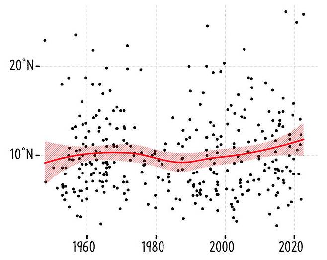 연도별로 슈퍼태풍 시작점의 위도를 계산해보면 점점 올라오고 있다는 게 눈에 띕니다. 아래 그래프의 추세선이 점점 상승하고 있는 게 한눈에 들어올 거예요. 1950년대의 슈퍼태풍의 평균 위도는 9.36°N. 반면 2010년대엔 10.40°N로 증가했어요. IPCC 보고서에서도 열대성 저기압의 경로가 앞으로 더 북쪽으로 이동할 가능성이 있다고 경고하기도 했습니다. 그런데 북쪽으로 올라오는 게 뭐가 문제길래 경고까지 하는 걸까요? 지금부터는 그 이야기를 해볼게요.