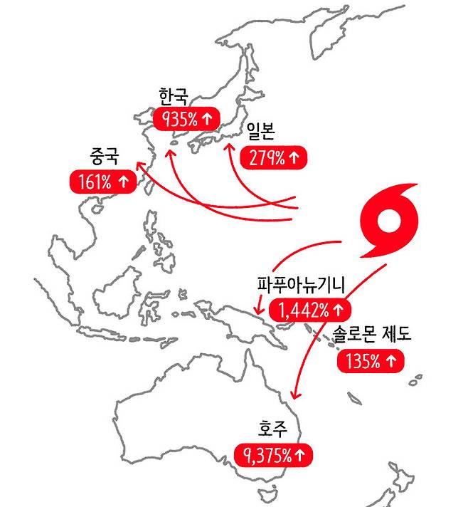 분석 결과, 앞으로 온실가스를 줄이지 않는다면 과거보다 강력한 태풍이 더 많이 발생하는 것으로 나왔습니다. 반면 힘이 약한 태풍은 줄어들었어요. 문제는 이렇게 늘어난 강력한 태풍에 더 많이 노출되는 국가를 분석해봤더니, 우리나라가 상위권에 포함된다는 점입니다. 우리나라는 과거에 비해 태풍 노출 빈도가 935% 증가할 것으로 예측됐는데 이 수치는 호주, 예멘, 파푸아뉴기니에 이어 전 세계 4위의 수치였어요.