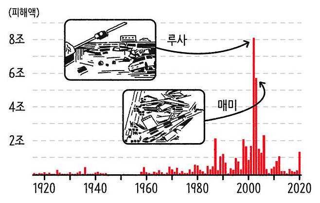 2020년 화폐가치 기준으로 피해규모를 환산해보면, 가장 많은 피해액을 기록한 해는 2002년입니다. 압도적으로 솟아있는 2002년의 막대가 보이죠? 피해규모가 무려 8조 1,062억 541만 9,267원입니다. 2023년 우리나라 정부 예산안에 외교와 통일 분야의 예산이 6조 4,000억 원 규모니까 얼마나 큰 피해인지 감이 올 겁니다. 8조가 넘는 피해액의 84.8%가 태풍의 영향이었습니다. 바로 2002년 8월에 대한민국을 강타했던 태풍 루사의 흔적이죠. 2등인 2003년도 마찬가지입니다. 9월에 상륙한 태풍 매미의 영향으로 5조가 넘는 피해규모를 남겼습니다.