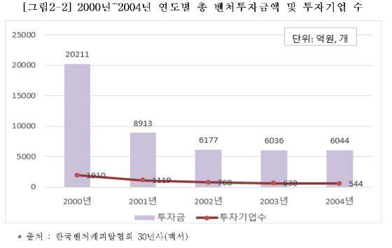 시장이 꽁꽁 얼어붙으면서 2000년 벤처투자 규모는 약 2조원, 1910개 기업에서 2004년 6044억, 544기업으로 투자금 기준 약 70%가 급감하는 등 시장 위기를 맞았다. 이 시기에 '모태펀드'가 구원등판했다. 수익성은 낮지만 뛰어나 기술력을 가진 기업들의 성장을 지원하고 '투자의 순기능'을 작동시키는 미션을 부여받았다.