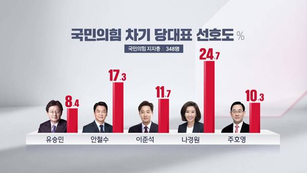 하지만 국민의힘 지지층만 보면, 나경원 전 의원이 24.7%로 1위였고, 안철수 의원 17.3%, 이준석 전 대표 11.7%로 나타났습니다.