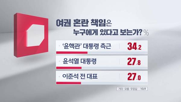 '윤핵관'으로 불리는 대통령의 측근을 꼽은 응답이 34.2%로 가장 많았고, 윤석열 대통령 27.8%, 이준석 전 대표 27%로 나왔습니다.