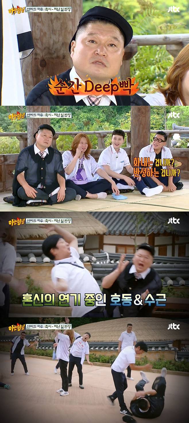 반성을 털어 놓는 시간에서 강호동은 "여기 넘어오기 전 장승 앞에서 쓰러지는 촬영 때 이수근이 갑자기 무릎으로 제 머리를 쳤다. 순간 화가났다. 촬영을 접어야 하나 했다"고 고백했다. 이상민은 분노에 차서 말하는 강호동에게 "화를 내는 거냐. 반성을 하는 거냐"고 지적했다.
