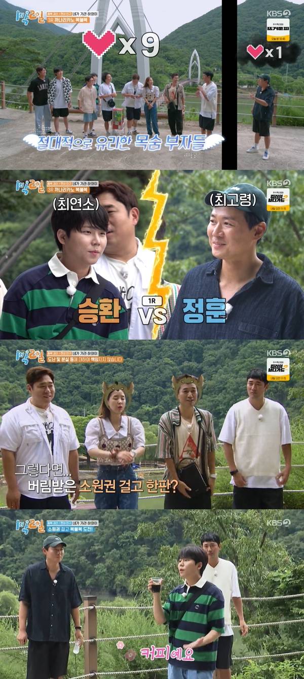 11일 방송된 KBS 2TV '1박 2일 시즌4'(이하 '1박 2일')에서 세 번째 게임이 이뤄졌다. 대결 종목은 까나리카노 복불복. 정승환은 "TV에서만 보던 것"이라며 놀랐다.