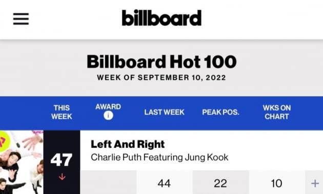 빌보드가 발표한 최신 차트(9월 10일 자)에 따르면, 정국과 찰리 푸스 협업곡 'Left and Right'(레프트 앤드 라이트)는 메인 싱글 차트 '핫100' 47위를 차지했다.