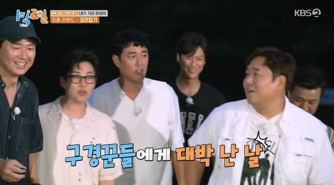 화양구곡에 도착한 출연자들은 입수를 결정할 꼬리잡기 대결을 펼쳤다. 1경기에서는 조한선이 잡고 있던 문세윤의 바지가 뜯어지면서 꼬리에서 떨어졌다. 김종민은 “한선이 되게 약해”라고 놀랐고, 딘딘도 “한선이 형 대박이다. 모든 곳에서 활약하고 있다”라고 약을 올렸다.