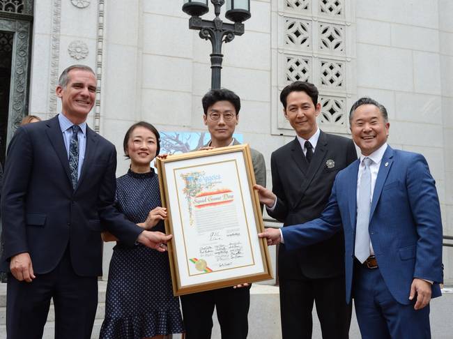 한국계 존 리 LA 시의원은 "황동혁 감독의 10년 넘는 열정과 한국 제작진 및 배우들의 헌신이 있었기에 전 세계적으로 큰 반향을 일으킨 '오징어 게임'이 탄생할 수 있었다”고 말했다.