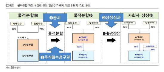 앞서 금융위원회는 지난 5일 물적분할 주주보호 방안을 발표했다.. 우선, 물적분할의 구체적인 목적(구조조정, 매각, 상장 등)과 기대효과, 주주보호 방안 등에 대한 공시를 강화하고, 상장기업 주주가 물적분할에 반대하는 경우 주식매수청구권을 부여한다. 또 물적분할 이후 5년 내 자회사를 상장하려는 경우 모회사 일반주주에 대한 보호 노력이 미흡하다면 상장이 제한된다.