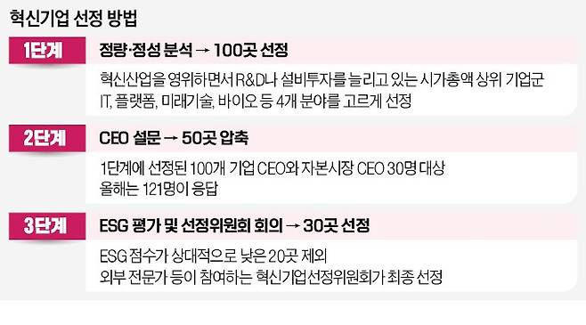 100개 기업 선별은 최근 매출이 3년 전보다 증가한 기업과 3년 평균 연구개발비가 매출 대비 5% 이상인 곳을 대상으로 이뤄졌다. 3년 평균 설비투자(CAPEX)가 매출의 10% 이상인 곳도 포함시켰다. 이들 가운데 사업보고서상 혁신 사업을 영위하는 시가총액 상위 기업을 뽑았다. 혁신 사업은 IT, 금융, 바이오, 인터넷·모바일, 미래 이동수단, 친환경, 우주, 가상세계, 게임, 로봇, 빅데이터, 핀테크, 미디어 등으로 구분했다.