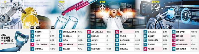 한경과 여론조사업체 입소스는 ‘2022 대한민국 혁신기업 30’을 선정하기 위해 100개 기업의 리스트를 CEO들에게 보내 혁신기업을 직접 선택해달라고 했다. 혁신기업은 △정보기술(IT) △플랫폼 △미래 기술 △바이오 등 네 가지 분야로 나눴다.