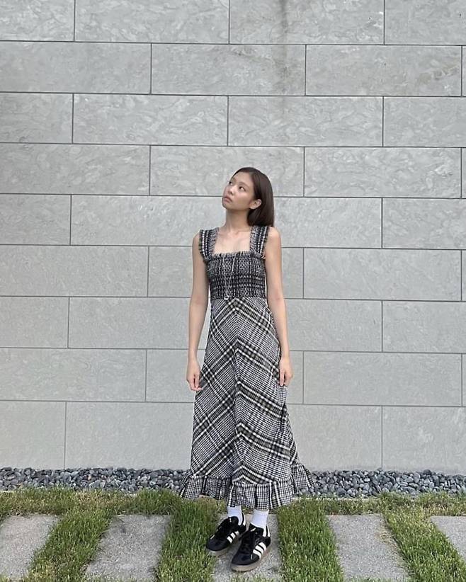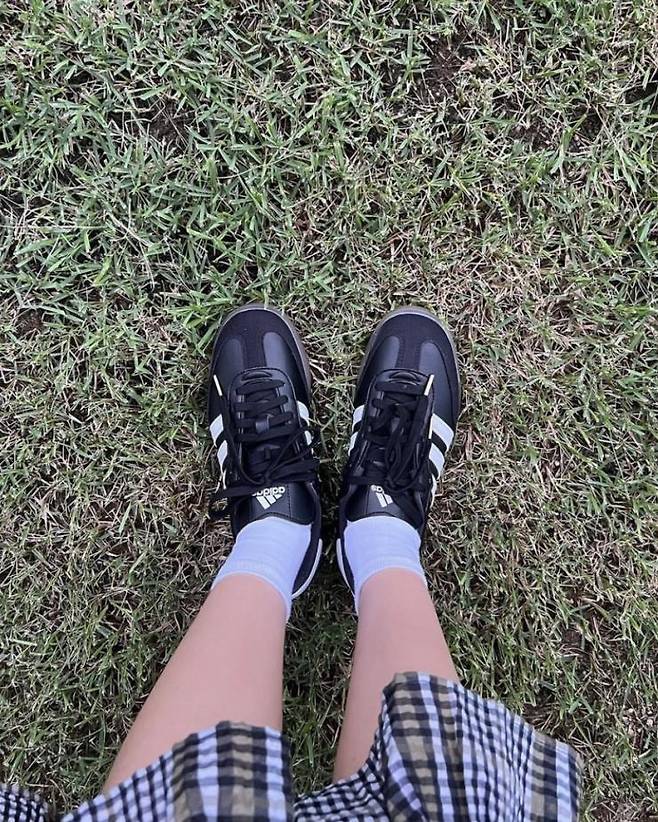 구찌와 아디다스의 콜라보로 인해 덩달아 구하기 하늘의 별따기가 된 가젤. 가젤 대체품으로 아디다스 삼바가 인기인데요! 얄쌍하면서 발에 착 붙는 디자인으로 인해 어떤 옷에도 코디하기 쉽고 클래식하다는 평을 받고 있어요. 제니는 삼바 블랙 컬러를 블랙 패턴의 원피스에 매치했습니다.