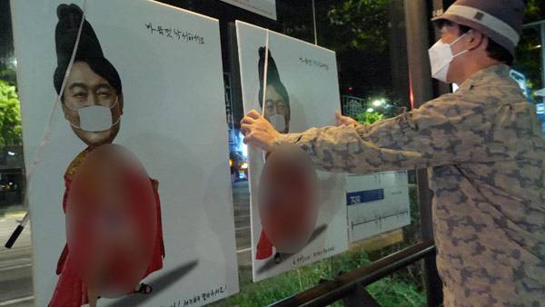 이 포스터는 풍자화가로 알려진 이하 작가가 오늘 새벽 삼각지역 일대에 부착했으며, 모두 10장인 것으로 알려졌습니다.