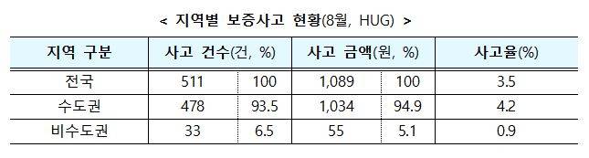 전세보증금 반환보증의 사고 통계도 공개됐다. 주택도시보증공사(이하 HUG)에 따르면 지난 8월 75개 지자체에서 총 511건(1089억원)의 보증사고가 발생했다. 전국 평균 보증사고율은 3.5%로 집계됐다. 보증사고율이란 당월 만기 도래 보증상품 총액 대비 반환되지 않은 보증금 비율이다.
