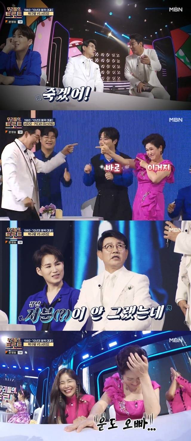 모두가 “좋아죽겠다?”고 몰아가자 설운도는 “저분이 안 그랬는데”라고 탄식해 웃음을 더했다. 이어 박구윤은 ‘갈대의 순정’을 선곡해 열창했다. 박구윤은 현철의 성대모사까지 선보여 웃음을 줬다. (사진=MBN ‘우리들의 트로트’ 캡처)