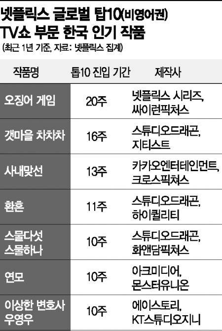 15일 업계에 따르면 최근 1년간 넷플릭스 TV쇼 부문 글로벌 톱 10에는 넷플릭스 한국 시리즈인 오징어게임을 비롯해 '지금 우리 학교는', '지옥', '수리남', '소년심판', '종이의 집: 공동경제구역' 등 다수 작품들이 포함됐다. 이외에도 '이상한 변호사 우영우'를 비롯해 '갯마을 차차차', '연모', '우리들의 블루스', '나의해방일지' 등 한국색이 짙은 작품들도 순위권에 올랐다.