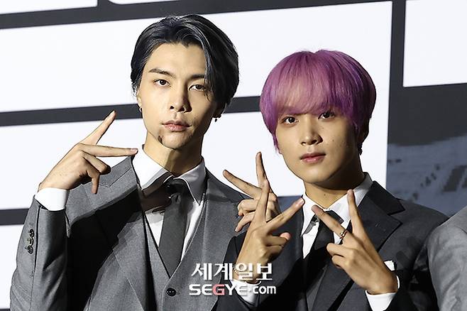 그룹 NCT 127 쟈니(사진 왼쪽)와 해찬이 16일 오전 서울 송파구 잠실로 소피텔 앰배서더 서울 호텔에서 열린 정규 4집 '질주(2 Baddies)'의 발매기념 기자간담회에 참석해 포즈를 취하고 있다.