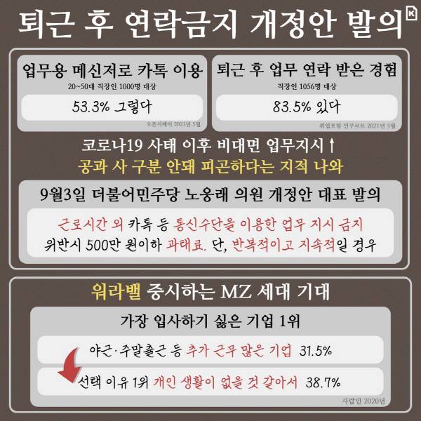 지난 8일 더불어민주당 노웅래 의원이 '근로시간 외 카톡 등의 통신 수단을 이용한 업무지시를 금지'하는 근로기준법 일부 개정안을 대표 발의했다.