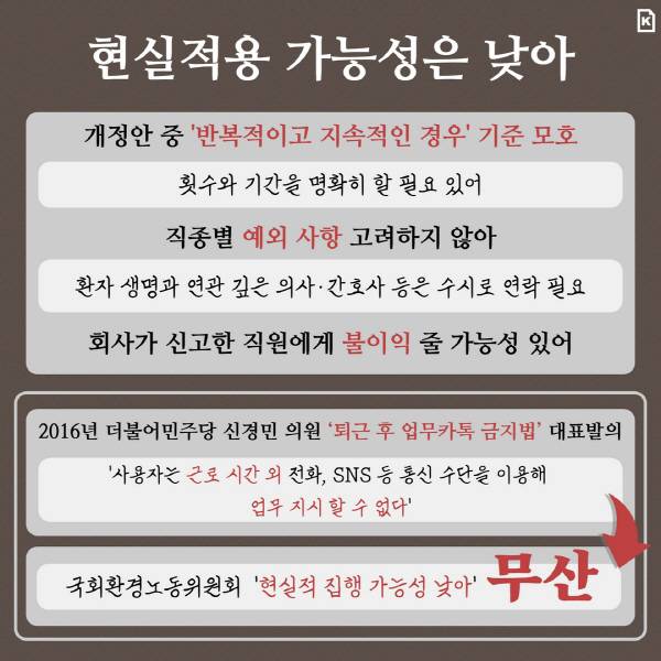 하지만 발의된 개정안은 현실 적용 가능성이 낮다는 지적이 나오고 있다. 발의된 법안에는 환자의 생명이 걸려있는 의사처럼 퇴근 후 연락이 불가피한 직종에 대한 예외사항이 존재하지 않는다. 또한 ‘반복적이고 지속적인 경우’라는 법안 내용의 기준이 모호하다는 지적도 있다. 과태료 부과의 기준은 명확해야 하나 횟수와 기간 기준을 모호하기 때문. 이어 회사에서 이를 위반해 신고한다 해도 회사에서 신고한 직원에게 불이익을 줄 수 있기에 현실적으로 적용하기 힘들다는 지적도 있다. 실제 2016년 6월 더불어민주당 신경민 의원이 ‘사용자는 근로 시간 외 전화, SNS 등 통신 수단을 이용해 업무 지시를 할 수 없다’는 개정안을 발의했으나 ‘현실적 집행 가능성이 낮다’는 국회노동위원회의 지적을 받아 무산됐다
