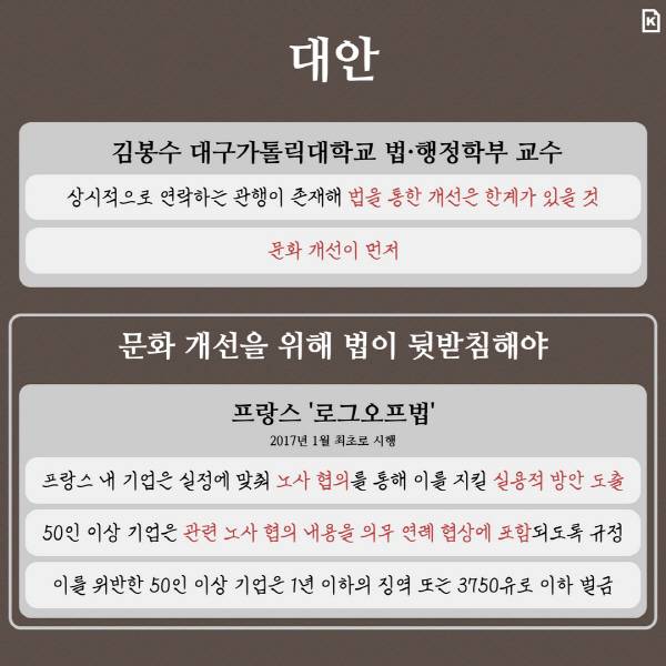 문화 개선을 위한 법이 뒷받침돼야 한다는 의견도 제기되고 있다. 프랑스는 2017년부터 노동법에 ‘연결되지 않을 권리’를 포함해 시행 중이다. 프랑스 내 기업은 실정에 맞춰 노사 협의를 통해 이를 지킬 실용적 방안을 도출해야 한다. 또한 50인 이상의 기업은 이에 관한 노사 협의 내용을 의무 연례 협상에 포함하도록 규정하고 있다. 이를 위반하면 50인 이상 기업의 사업주에게는 1년 이하의 징역 또는 3750유로 이하의 벌금이 부과된다.