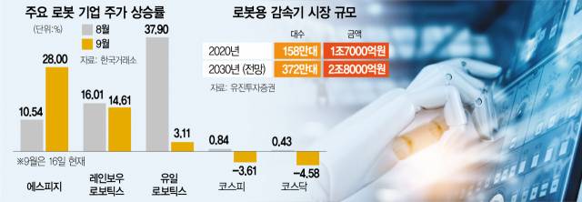 증권가는 에스피지·레인보우로보틱스 등 국내에서도 뛰어난 기술력을 보유한 종목에 주목할 것을 권하고 있다. 점차 커지는 로봇 시장에서 가장 빠르게 시장 지배력을 키워갈 힘을 보유하고 있다는 이유에서다. 다른 로봇 관련주의 주가가 같은 기간 마이너스를 기록한 반면 에스피지 등 주요 기업들이 큰 성장률을 보인 것도 같은 맥락이다. 양승윤 유진투자증권 연구원은 “에스피지와 에스비비테크 등이 기술의 국산화에 성공하면서 시장에 진입하기 시작했다”며 “후발 주자들이 공급 레퍼런스를 쌓고 신뢰도를 높여간다면 10년 후 소형 정밀 감속기 시장의 판도는 일본 기업의 독주 체제에서 크게 바뀌어 있을 것”이라고 내다봤다.