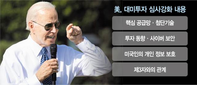조 바이든 미국 대통령은 15일(현지 시간) 외국인 투자를 국가 안보 차원에서 철저히 감독하도록 하는 내용의 행정명령에 서명했다. 외국인투자심의위원회(CFIUS)가 외국인 투자가 국가 안보에 미치는 영향을 평가할 때 핵심 공급망, 첨단기술, 투자 동향, 사이버보안, 미국인의 개인정보 보호 등 다섯 가지 요인을 고려하라는 지침을 담은 게 핵심이다. 백악관은 “국가 안보 환경이 진화함에 따라 CFIUS의 심사 절차도 진화해야 한다”며 행정명령 발동의 배경을 설명했다. CFIUS에 행정명령이 내려진 것은 1975년 설립 이후 처음이다.