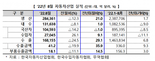 16일 산업통상자원부가 발표한 '2022년 8월 자동차산업 동향'에 따르면 지난 8월 국내 자동차 산업은 전년 동월 대비 생산 21.0%, 내수 1.0%, 수출 29.1% 모두 증가한 것으로 나타났다.