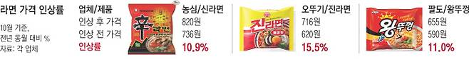 라면시장 1위 업체인 농심은 전날부터 라면 출고가격을 평균 11.3% 올렸다. 신라면은 10.9%, 너구리는 9.9% 가격이 조정됐다.