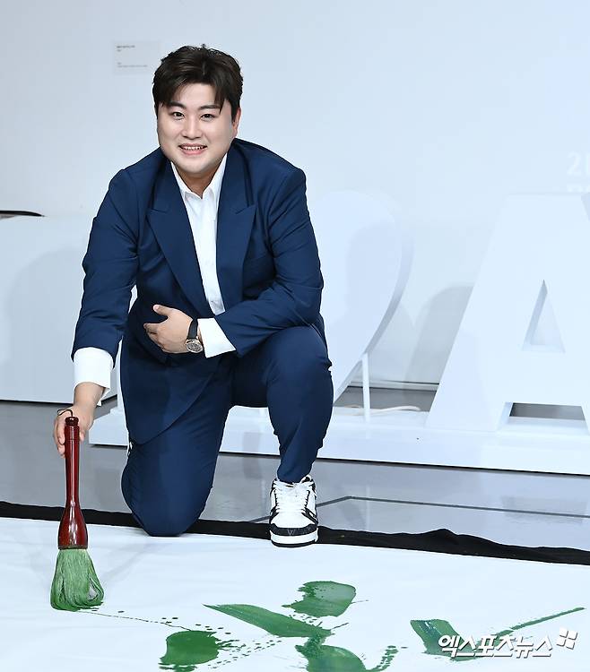 가수 김호중이 전시회 오픈 행사에 참석해 포토타임을 갖고 있다.