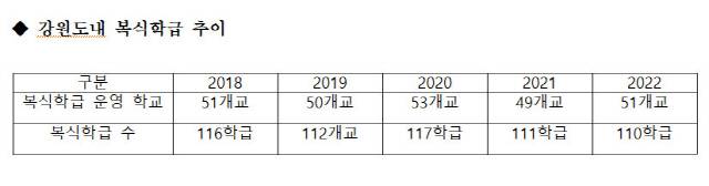 본지 취재결과 올해(4월 기준) 도내에서 운영 중인 복식학급은 51개 학교, 110학급이다. 지난 2018년 51개 학교, 116개 학급이었던 도내 복식학급은 2019년 50개 학교(112개 학급), 2020년 53개 학교(117학급), 2021년 49개 학교(111학급) 등 꾸준하다.