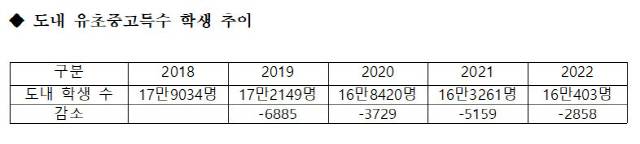 지난 2018년 17만9034명이었던 도내 유·초·중·고·특수 학생 수는 2020년 16만8420명, 2021년 16만3261명으로 매년 감소를 거듭했다. 올해는 16만403명을 기록, 지난 2018년과 비교해 1만8631명(10.4%) 줄었다.