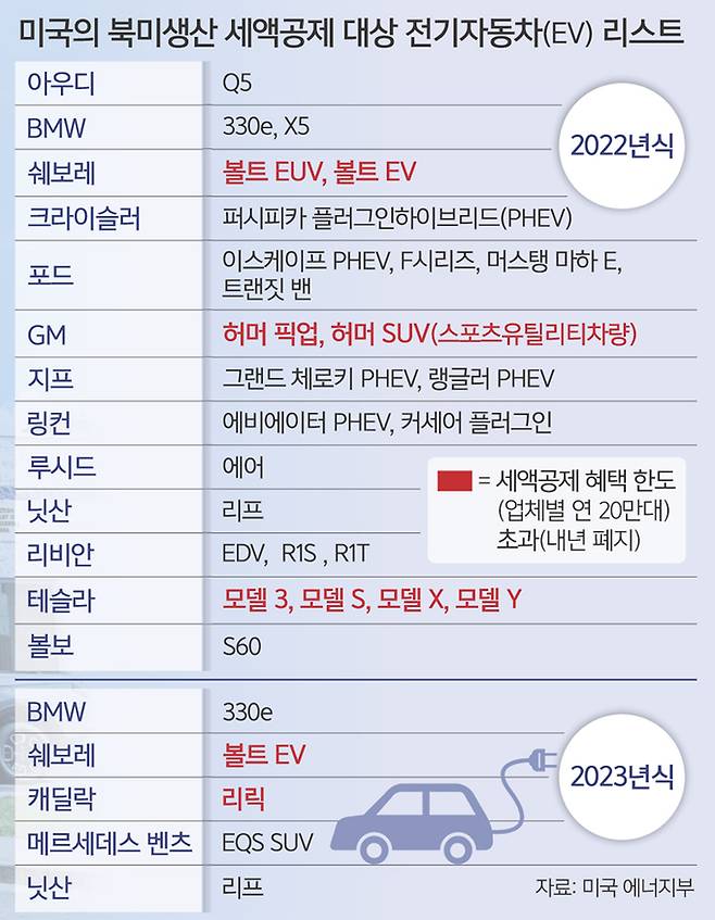 미국 에너지부에 따르면 2022년식과 2023년식 기준으로 최대 7500달러에 해당하는 세액공제 혜택을 받는 전기차 33종(그중 10종은 누적 판매 기준 도달)에 전량 한국에서 생산되는 현대 아이오닉5, 기아 EV6는 빠졌다.