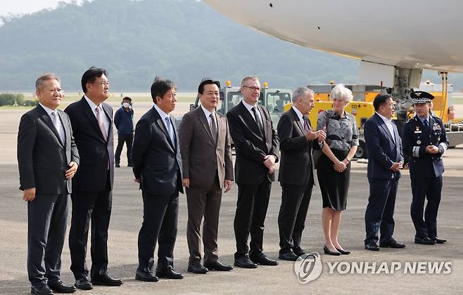 (성남=연합뉴스) 서명곤 기자 = 국민의힘 정진석 비상대책위원장, 김대기 대통령 비서실장, 이상민 행안부 장관 등이 18일 오전 성남 서울공항에서 윤석열 대통령 환송을 위해 대기하고 있다. 2022.9.18