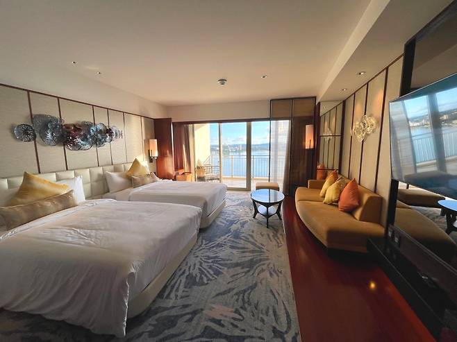 호텔 닛코 괌 오션프론트 프리미어 룸. 30년이란 세월을 속일 순 없어도, 생각보다 깔끔하게 잘 관리된 듯했다. 다만 곳곳에서 느껴지는 노화의 흔적은 감출 수 없었다. 특히 화장실이 가장 아쉬웠다. 일반 객실엔 록시땅 어매니티가 제공되고, 프리미어 이상부터는 괌에서 유일하게 영국 황실이 사용했던 고급 향수로 유명한 앳킨슨 어메니티를 제공한다. 괌 호텔 최초로 친환경 소재를 사용한 허스키(Huskee) 텀블러를 전객실에 비치해 기념품으로 증정하는 점도 독특하다. 이 텀블러를 들고 로비 파운틴 카페를 방문할 경우 50% 할인을 받을 수 있다.