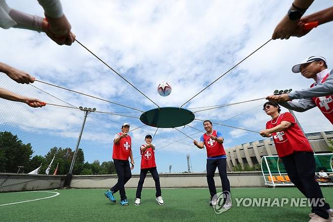 (서울=연합뉴스) 김도훈 기자 = 18일 오전 서울 잠실종합운동장 풋살경기장에서 열린 2022 서울시민체육대축전 협동바운스 대회에 출전한 영등포구 주민들이 연습을 하고 있다. 2022.9.18