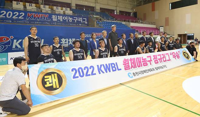 [서울=뉴시스] 추상철 기자 = 18일 오후 강원 춘천 호반체육관에서 열린 ‘2022 KWBL 휠체어농구리그’ 3라운드, 정규시즌 우승을 차지한 춘천시청 선수들이 기념촬영을 하고 있다. (사진= 한국휠체어농구연맹 제공) 2022.09.18. photo@newsis.com *재판매 및 DB 금지