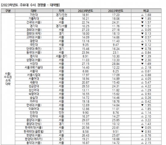 18일 종로학원이 2023학년도 수도권·지방거점 국립대 31개교의 수시모집 경쟁률을 분석한 결과 평균 경쟁률은 16.44대 1로 집계됐다. 지난해(15.84대 1)보다 소폭 상승했다.