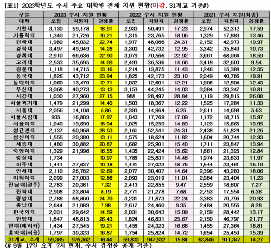 [아시아경제 한진주 기자] 올해 주요 대학의 수시모집 경쟁률이 지난해보다 상승했다. 학령인구가 줄어들었지만 N수생들이 주요대 논술·종합전형에 대거 지원하며 전체 수시 경쟁률을 끌어올렸다. 수시 비중을 늘린 지방대들은 전년 대비 경쟁률이 대부분 감소했다.