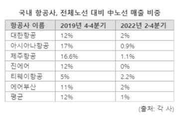 올해 2·4분기 대한항공, 아시아나항공, 제주항공, 진에어, 티웨이항공, 에어부산 등 주요 항공사들의 전체노선 대비 중국노선 매출 비중은 평균 1%였다.
