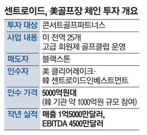 18일 투자은행(IB) 업계에 따르면 센트로이드는 최근 클리어레이크와 미국 내 25개 고급 골프클럽을 운영 중인 콘서트골프파트너스를 공동 인수하는 작업을 마쳤다. 센트로이드와 클리어레이크가 기존 소유주인 글로벌 최대 투자사 블랙스톤에서 콘서트골프파트너스를 인수한 가격은 5000억원대다. 센트로이드는 이 중 약 1000억원을 새마을금고중앙회 등 국내 주요 기관투자자들에서 모집해 인수에 참여했다.