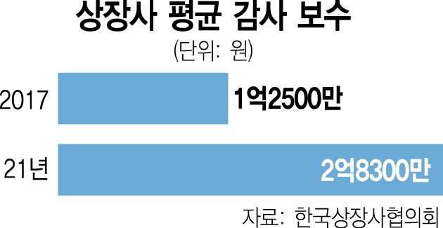 18일 한국상장사협의회 조사에 따르면 국내 상장회사 평균 감사 보수는 2017년 1억 2500만 원에서 지난해 2억 8300만 원으로 2배 이상 증가했다. 이 수치는 감사인주기적지정제 시행과 무관하지 않다는 게 업계 주장이다. 기업들이 정부가 지정한 회계법인이 요구하는 대로 감사 보수를 줘야 하는 탓에 기업들은 적잖은 부담을 느끼고 있다는 얘기다.