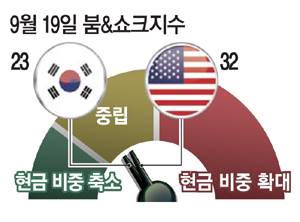매일경제와 크래프트테크놀로지스가 공동 개발한 인공지능(AI) 기반 주식 위험 관리 지표인 '붐&쇼크' 미국판 지수가 19일 32를 가리키며 전주(25) 대비 위험도가 더 높아졌다.