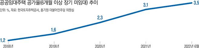 18일 국회 국토교통위원회 소속 홍기원 더불어민주당 의원이 한국토지주택공사(LH)에서 받은 자료를 보면 6개월 이상 장기 미임대 상태인 공공임대주택은 6월 말 기준 3.5%로, 최근 4년 새 공가율이 3배 가까이 증가했다. 공공임대주택 100개 중 평균 3~4개가 6개월 이상 새 입주자를 구하지 못하고 비어 있다는 얘기다. 공가율은 2018년 1.2%에서 2019년 1.6%, 2020년 2.3%, 2021년 3.1%로 매년 증가 추세에 있다.