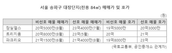 잠실새내역 인근 공인중개소 관계자는 "잠실엘스 전용 84㎡ 1층이 19억5000만원에 나와 화제가 됐지만, 1층이라는 특수성 때문에 집주인들은 아직 20억원선이 붕괴됐다고 생각하지 않는다"며 "선호동의 중층 이상 매물이 20억원 아래에서 팔리면 충격이 있을 것"이라고 전했다.